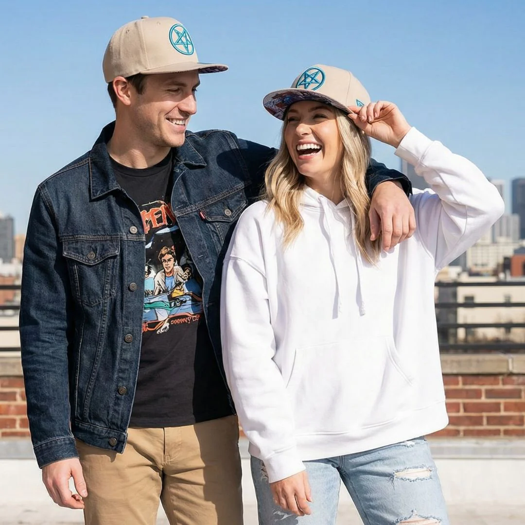 Cursed Dentist is a beige snapback with a beige brim. The front logo is a blue pentagram. The left side of the snapback is embroidered with the traditional ‘C’ logo of Capiche and the back side is embroidered with ‘Capiche’. The embroideries are blue. The brim bottom is covered with the Cursed Dentist design.