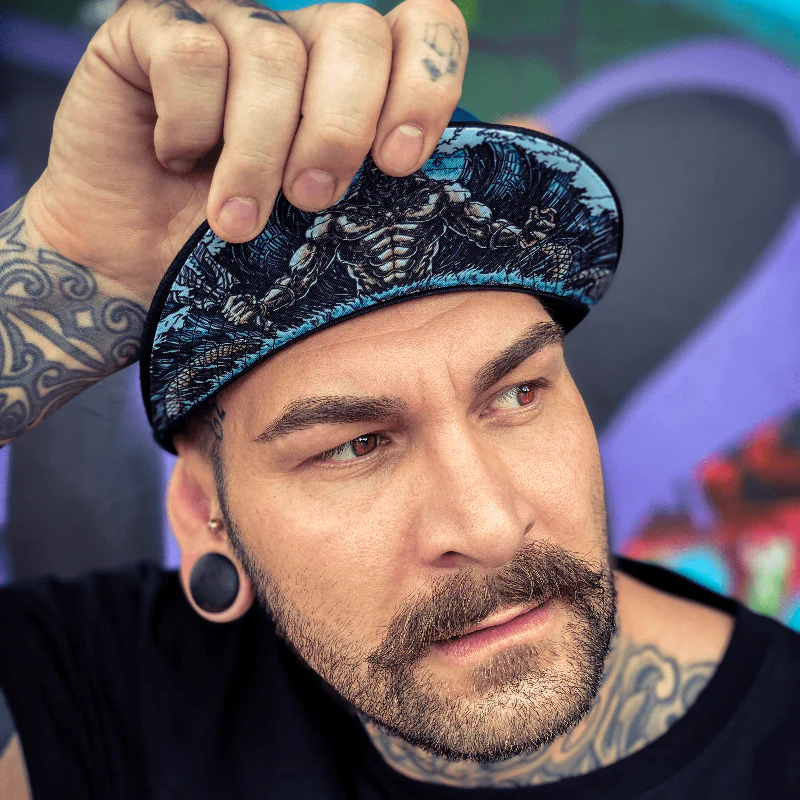 Poseidon is a blue snapback (for adult) and a curved baseball cap (for kid) with a black brim. The front logo is a white trident. The left side of the snapback is embroidered with the traditional logo of Capiche and the back side is embroidered with “Capiche”. The embroideries are in white. The brim bottom is covered with the Poseidon design. The Poseidon cap is part of the Ancient Greek collection.