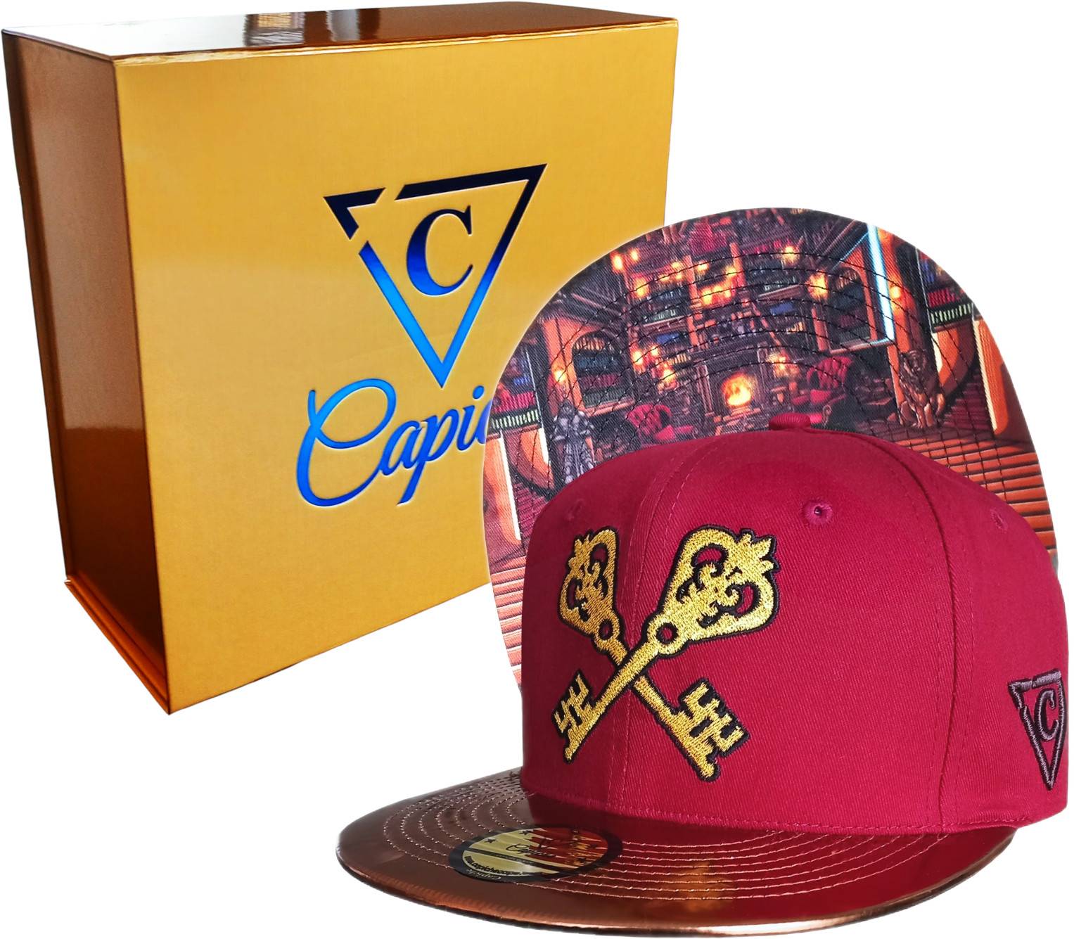 Hidden Room Child is an epic and a mysterious snapback at the same time, with an epic brown metallic brim and a mysterious design of a hidden room. Have you discovered the hidden door already? The front logo are the golden keys to the hidden room. The left side of the snapback is embroidered with the traditional ‘C’ logo of Capiche, the right side with a wand (which is the Wizard Collection logo) and the back side is embroidered with ‘Capiche’.