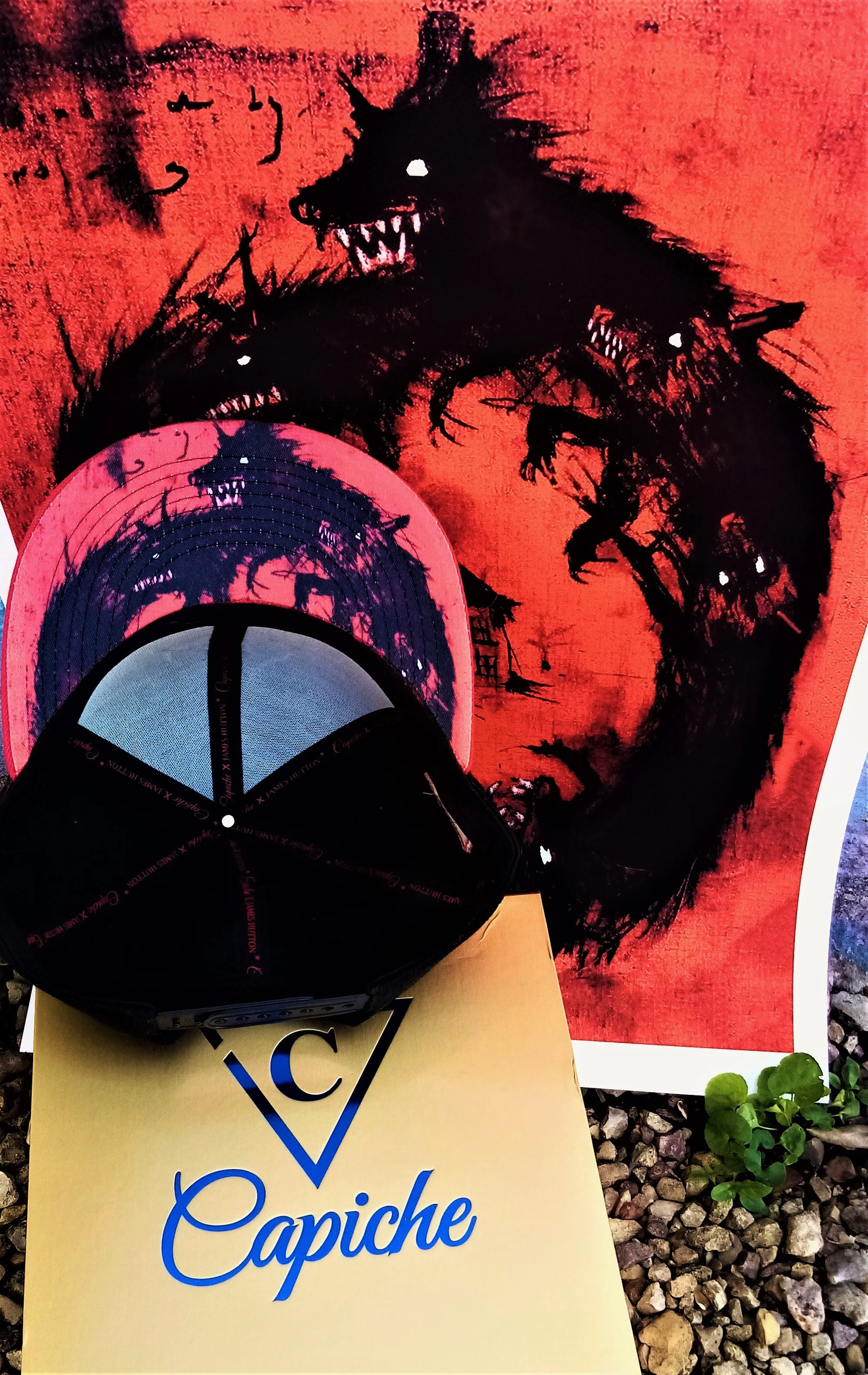 This collaboration snapback is black with a red brim. The front logo is a cool design James came up with. The left side of the snapback is embroidered with the traditional C logo of Capiche, the right and back side are not embroidered to keep a really clean look on the cap. The embroidery is in red. The brim bottom is covered with the scary wolves.