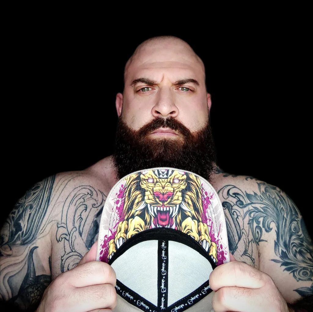 Lion is a beige curved baseball cap with a beige brim. The front logo is a golden lion logo. The left side of the baseball cap is embroidered with the traditional C logo of Capiche and the back side is embroidered with Capiche. The embroideries are gold/yellow. The brim bottom is covered with the Lion design.