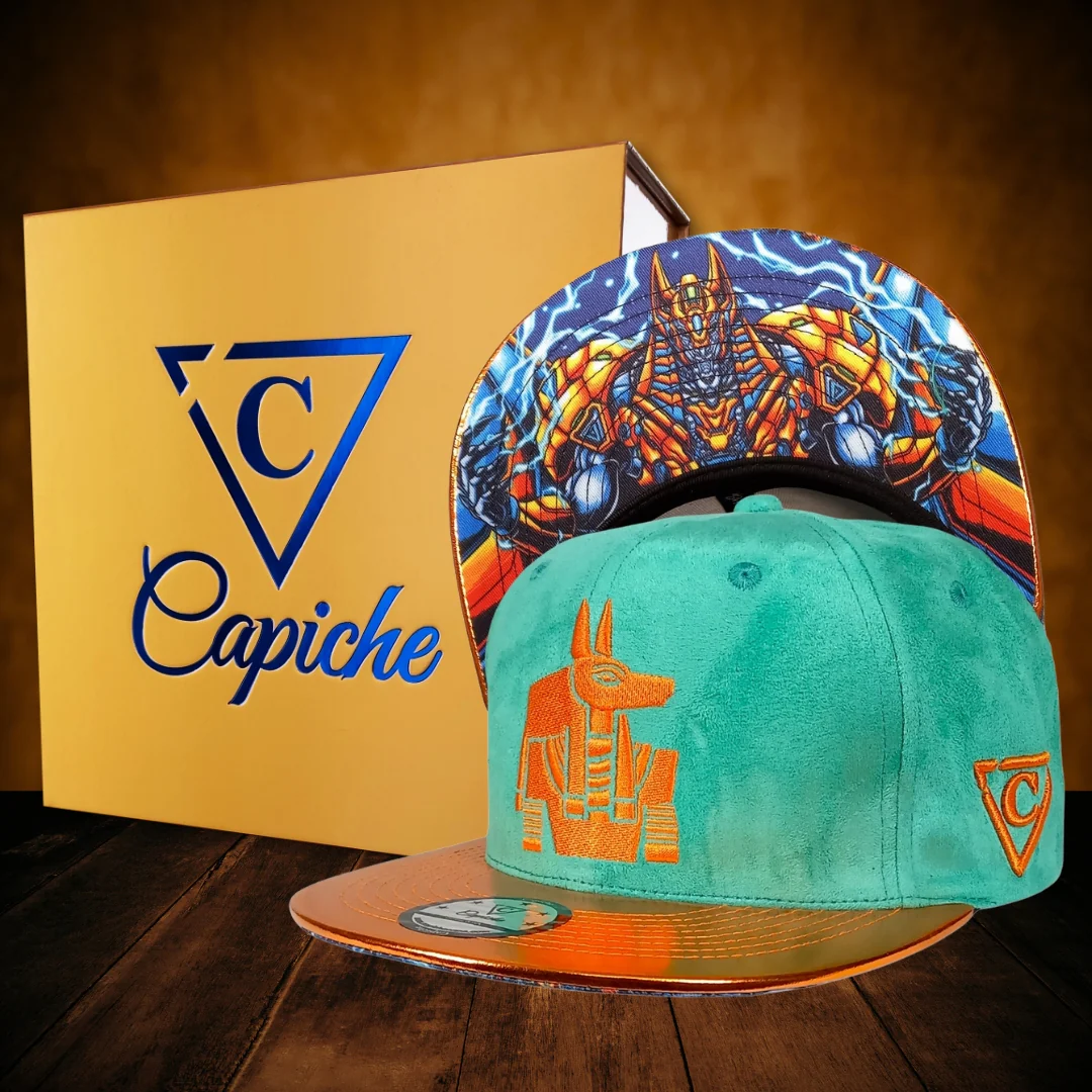 Robot Anubis is an edgy statement piece in your cap collection because of the mint green soft suede and orange crackling metallic brim. The snapback will be delivered in a golden magnetic box. The golden box is perfect as storage but also as a gift box. It’s the perfect way to treat yourself! The snapback has an extremely comfortable fit and it’s adjustable at the back. The snapback is one-size and fits any head, it fits most perfect for heads between 56 and 63 cm or between 22 and 24.8 inches.
