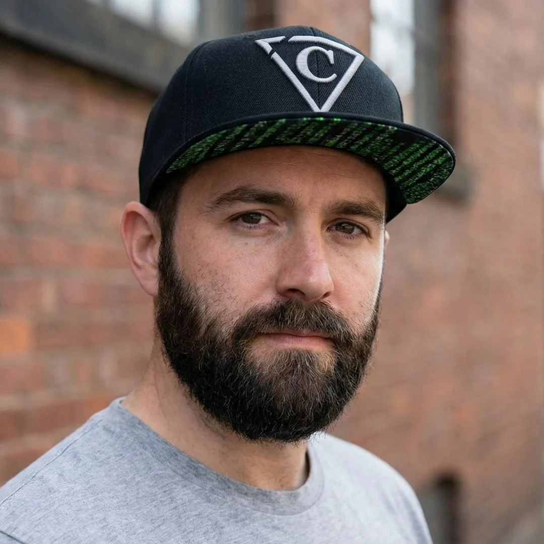 The Hacker is a black snapback with a black brim. The front logo is a grey Capiche logo. The back side of the snapback is embroidered with āCapicheā. The embroideries are in grey. The brim bottom is covered with the The Hacker design.