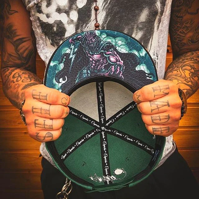 Zeus is a green snapback with a black brim. The front logo is a black trident. The left side of the snapback is embroidered with the traditional logo of Capiche and the back side is embroidered with “Capiche”. The embroideries are in black. The brim bottom is covered with the Zeus design. Zeus snapback is part of the Ancient Greek collection.